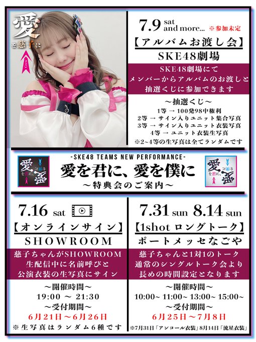 松本慈子@chikako_1119 -- オンラインサイン会の受付は今日までです!今回は、生写真にサインとみんなのお名前書かせてもらうよ☺️🍦 twitter.com/chikako_crew/s… 松本慈子応援アカウント⚓️ ★ #松本慈子 ちゃん情報 ★【本日受付締切】「#愛を君に愛を僕に 」 オンラインサイン会・開催日 → 7月16日19時〜・受付締切 → 6月26日23時59分limista.jp/projects/3117※今回は公演全体曲衣装のソロ生写真(ランダム6種)へのサインになります✍️※ロングトーク会も受付中です🫶🏻 pic.twitter.com/sMSBNJRFSB
