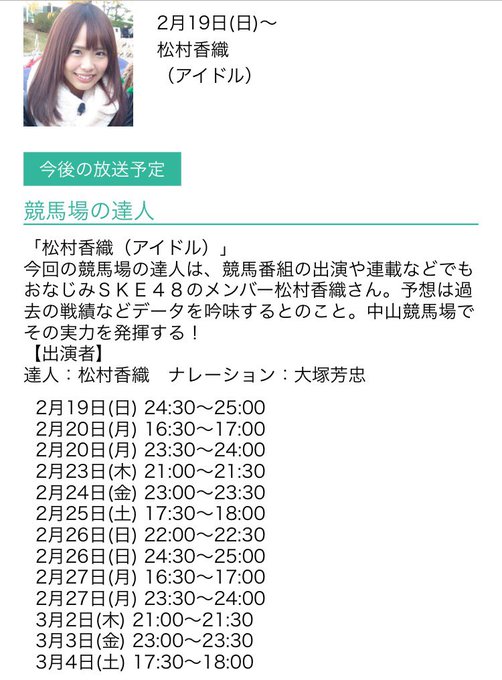 グリーンチャンネルぜひチェックしてくださいっ💓 #競馬場の達人 #松村香織 #グリーンチャンネル #SKE48 pic.twitter.com/tPIj7rT2oi