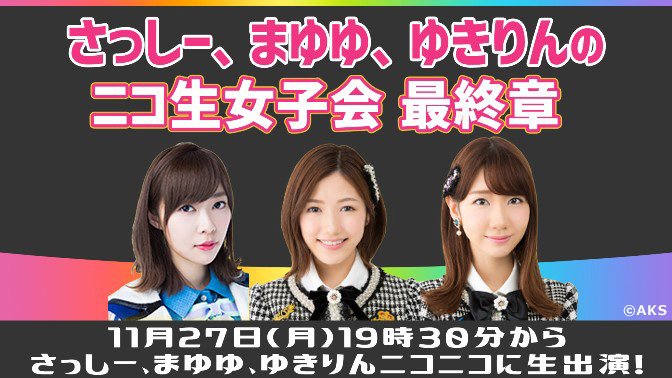 柏木由紀@Yukiriiiin__K -- 19:30からみてねー😊👏 twitter.com/nicolive_pr/st… ニコニコ生放送【ニコ生公式】 🕐本日27(月)13時~💕さっしー、まゆゆ、ゆきりん 最後の #ニコ生女子会💕▼番組タイムテーブル13:00~AKB48ミュージックビデオ一挙放送19:30~さっしー、まゆゆ、ゆきりん生出演➡live.nicovideo.jp/watch/lv308666…#指原莉乃 #柏木由紀 #渡辺麻友 pic.twitter.com/lX9KUpaSb7