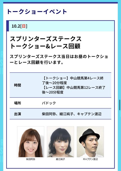 柴田阿弥 AyaShibata@_shibata_aya -- お知らせ🖋スプリンターズSの日にパドック前でレース回顧トークショーに出演します!イベントだよ👼みんな中山競馬場のパドック前に遊びに来てね!楽しみ! pic.twitter.com/RRgJyhzvVy