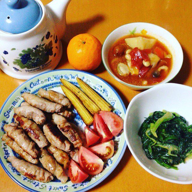 桑原みずき♡MIZUKI@little_mamy_19 -- ごはん🍴🎀豚の梅巻き🎀ネギの酢味噌和え🎀トマトスープ今年のバレンタインは、初めてチーズケーキを作りました❤️甘すぎず、好みの味でおいしかった😍 pic.twitter.com/MuOYNvYwey
