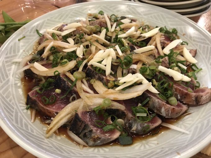 鰹のたたき、まぐろ、お寿司、牡蠣、枝豆、ビール、桂月、餃子、唐揚げ、司牡丹、たこ焼き、ほうじ茶ソフトクリーム…
