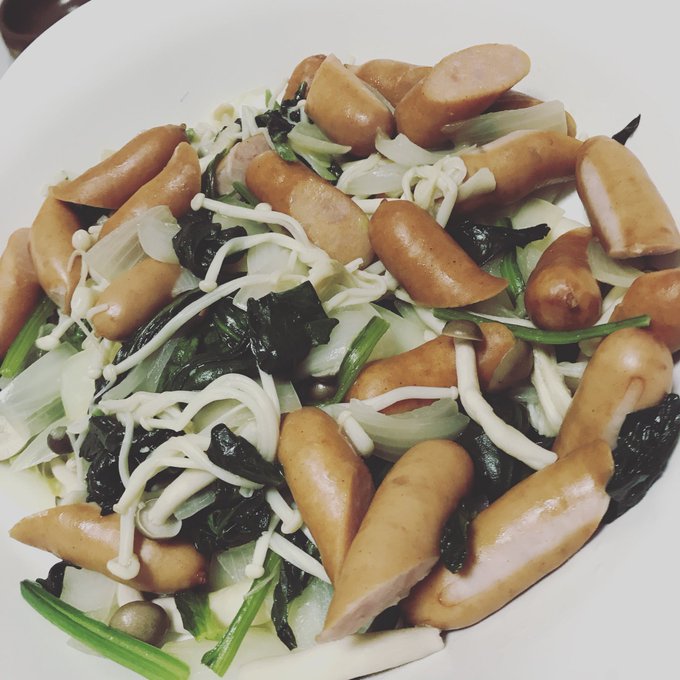 急に野菜を摂りたくなった時のごはん🍴フライパンにバターを入れて、玉ねぎ、ほうれん草、しめじ、えのき、ウィンナーを炒める🔥焼肉のタレと生卵を溶いたやつに絡めて食べると最高です✨ポン酢も👍簡単やきやってね♪