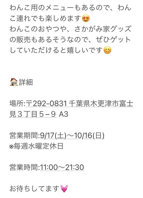 桑原みずき@little_mamy_19 -- ⦅告知⦆㊗️💓🐶9月17日(土)〜1ヶ月限定で、さかがみ家カフェがオープンします😺💓私は9/17(土)と9/18(日)、17:30頃〜お手伝いする予定です❣️わんこ連れじゃなくてもご来店頂けますので、皆さんにお会いできるのを楽しみにしています✨#さかがみ家 #ドッグカフェ #カフェ #犬連れ #千葉 #木更津 pic.twitter.com/qSi2ySbhzX