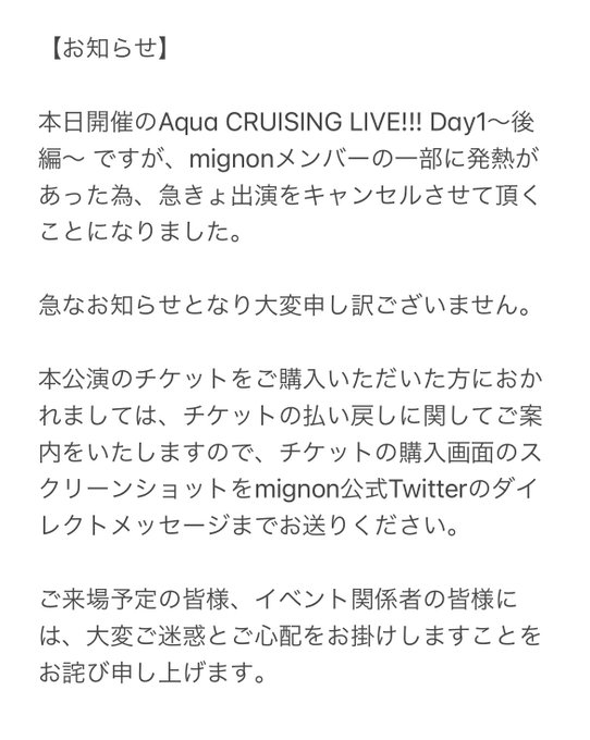 本日のライブ出演をキャンセルさせていただきます。