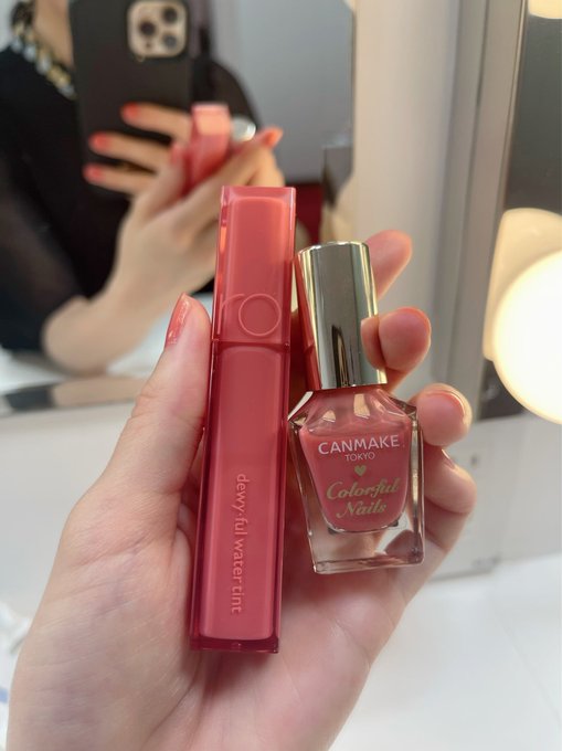 横山由依@Yui_yoko1208 -- 今日のリップとマニキュアの色似てた!!かわいい🫶2枚目は、マネージャーさんの話が気になった私です💄ロムアンド 03 イフローズ💅CANMAKE N51 pic.twitter.com/Lby3IL0Akl