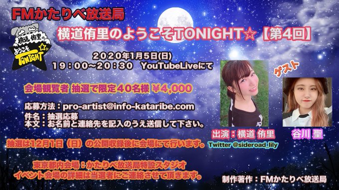 横道侑里@sideroad_lily -- おはようござます!今年一発目、初仕事!しかもそれひじりんとできるなんて~☺️✨楽しもうね!みんなみてね~!!! twitter.com/yukihisaito/st… Yukihisa Ito(伊藤P) #拡散希望 #横道侑里 #谷川聖 #FMかたりべ放送局 #公開生放送 #謹賀新年 『横道侑里のようこそTONIGHT⭐️』📺MC:横道侑里スペシャルゲスト:谷川聖新年スペシャル㊗️🎍2020年1月5日(日)19:00-20:30公開生放送🎊プロデューサー:鈴木真悟演出:伊藤幸久構成:ほりでーぐっさん pic.twitter.com/b1dYljpkrD 横道侑里@sideroad_lily -- あ!これ!場所間違ってる!中目黒のコットンビルってとこの3階みたい! 横道侑里@sideroad_lily -- えぇごめんなさい、しらなかった、ごめんなさいみなかったことに😭😭😭😭😭なんにもなかったです。今日たのしみましょう!