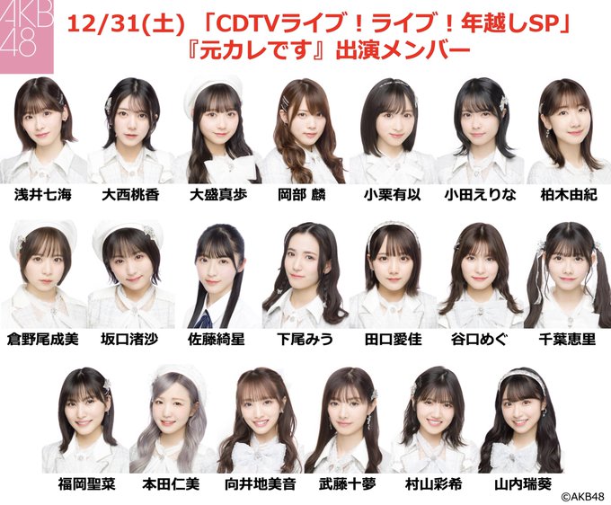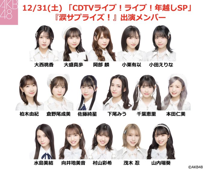水島美結(AKB4817期研究生)@miyuu_mizushima -- 24:00台の涙サプライズに出演させていただきます!ぜひみてください👀💕🫰 twitter.com/akb48_staff/st… AKB48公式 \✨🐰出演メンバー発表🐰✨/本日23:45〜放送🌟CDTVライブ!ライブ!年越しSP2023年最初のステージは❣️🎶24時台「涙サプライズ!」🎶25時台「元カレです」#AKB48#CDTVライブライブ#涙サプライズ#元カレですで、たくさん盛り上げてね💝簡単ツイートはこちら👇twitter.com/intent/tweet?t… pic.twitter.com/gg2OyWlRsD 橋本恵理子(AKB48 17期研究生)@erichan_akb48 -- @miyuu_mizushima みずみんおめでとう🎉リアタイで見とくよ👀! 水島美結(AKB4817期研究生)@miyuu_mizushima -- @erichan_akb48 えりちゃんありがとう😚💕帰ってくるの待ってる〜!!!
