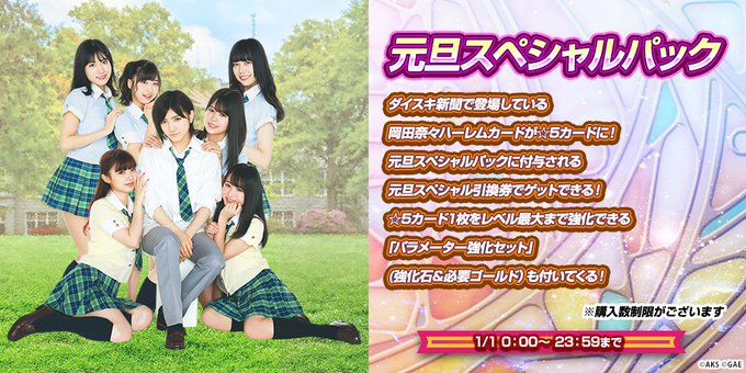 橋本陽菜@harupyon_0525 -- 是非ゲットしてください❤️❤️❤️ twitter.com/akb48_dice/sta… AKB48ダイスキャラバン 🌟本日限定『元旦スペシャルパック』🌟⚠️入手必須⚠️#AKB48ダイスキャラバン に、本日のみ入手可能な「元旦スペシャルパック登場‼️「ダイスキ新聞」にも掲載された❤️#岡田奈々 ハーレムカット❤️の☆5カードを入手できる「引換券」が封入されています♪詳細はゲーム内「お知らせ」をチェック! pic.twitter.com/MM2JayMzUR