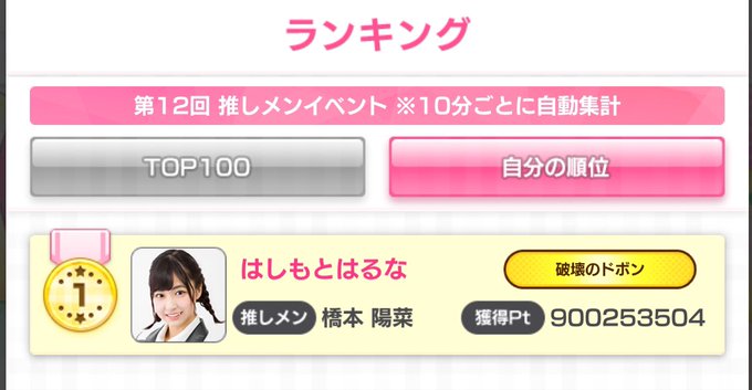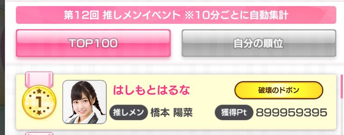 橋本陽菜 🐰(AKB48 チーム8.チームK)@harupyon_0525 -- 9億突破😁😁個人ポイントこんなにいくの初めて✌️ 今回マッチポイントもあるからその分みんなと出会えててそんたk…いや、されてないよね(笑)🙄#AKB48のドボン pic.twitter.com/8ia0B9cqQS