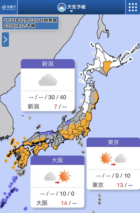 今日(22日)は、北日本は日本海側を中心に断続的に雪❄️吹雪となる所も☃️