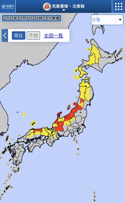 日本海側では大雪や吹雪となり、現在赤色の地域では大雪警報が出ています⚠️