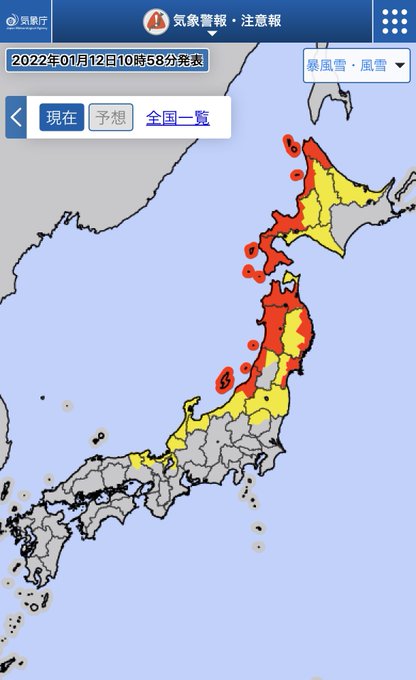 今日(12日)は、北日本や北陸では猛吹雪なっている所があり、現在赤色の地域では暴風雪警報が出ています⚠️