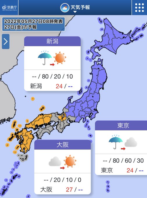 東日本や北日本では雨☂️