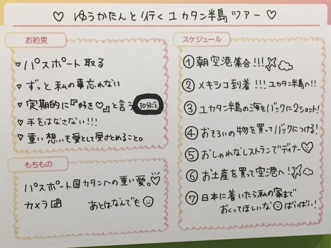 「ゆうかたんと行くユカタン半島デート」、約束しっかり守って持ち物ちゃんと持って私と一緒に行ってくれる人挙手!!!! pic.twitter.com/uQHaTvHmO3