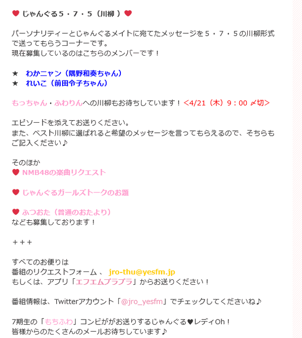 浅尾桃香【NMB48】@momoka__asao48 -- わかニャンとれいこさんにきていただきます💞💞お便りお待ちしてます!!!! twitter.com/jro_yesfm/stat… YES-fm【じゃんぐる❤レディOh!】 #じゃんレディ木 次回メイトが決定しました☺️✨#わかニャン(#隅野和奏ちゃん)#れいこ(#前田令子ちゃん)上記2名と #もっちゃん #ふわりん 宛の川柳をお待ちしてます📻4/21(木)9:00までに [email protected] へメールをお送りください😊yesfm.jp/jungle/nmb48/m…#もちふわ