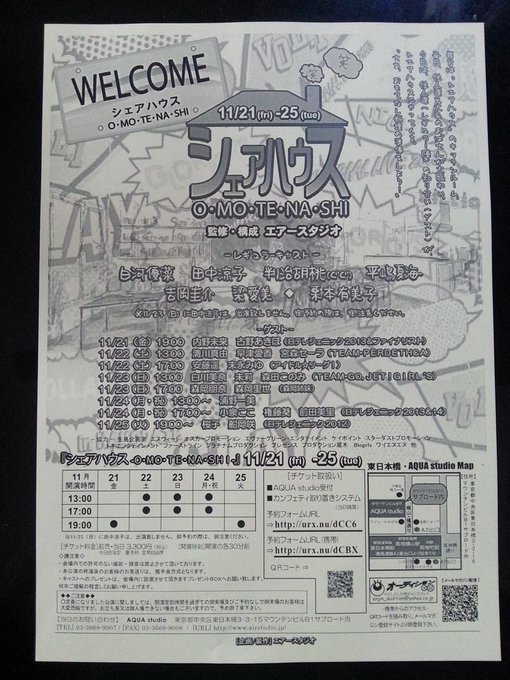 浦野 一美@urano_cindy1023 -- 「シェアハウス-O・MO・TE・NA・SHI-」11/24 @アクアスタジオ予約URL urx.nu/dCC6予約URL(携帯) urx.nu/dCBX pic.twitter.com/u7gsX4UZ5T今日でーす(^ν^)
