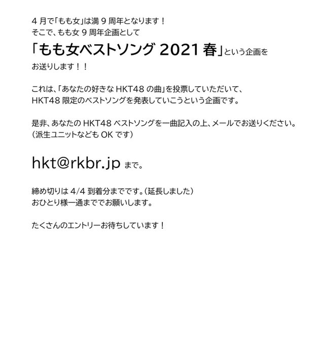 渕上舞(HKT48)@maichan_F_0921 -- 9周年企画、本日まで!ぜひエントリーお待ちしてます🙆♀️☞[email protected]次回あさっての放送で、もも女9周年です👏🍑(特別プレゼントがあるとかないとか👀) twitter.com/hktmomochihama… HKT48のももち浜女学院【RKBラジオ】 4月で「もも女」は満9周年となります!そこで、もも女9周年企画として「もも女ベストソング2021春」という企画をお送りします!!エントリーなど、詳しくは添付をご覧ください。たくさんのエントリーお待ちしています!#もも女 #HKT48 #RKBラジオ #radiko #渕上舞 #松岡はな #地頭江音々 pic.twitter.com/wwaiZacTpc