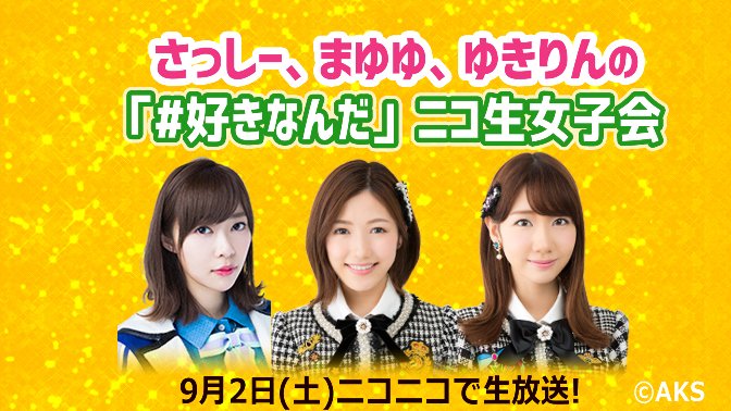 渡辺麻友@karaage_mayu -- このあと!8分後!ニコ生!でる twitter.com/nicolive_pr/st… ニコニコ生放送【ニコ生公式】 🕐本日9/2(土)13時~💕#さっしー #まゆゆ #ゆきりん のニコ生女子会💕今回はカラオケもしちゃいます🎤▼スケジュール13時~AKB48 MV一挙放送19時30分~女子会生放送✨➡live.nicovideo.jp/watch/lv305547…#指原莉乃 #柏木由紀 #渡辺麻友 pic.twitter.com/PlEBXId3P7