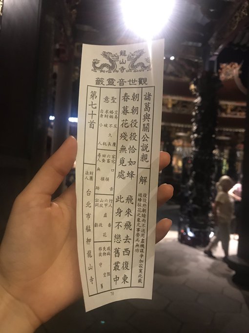 いろんなお願いが出来る中、恋愛に関する珍しい籖を引き当てて。直近の占い事は当たるんだって!自分でも結婚はまだまだだろなと思いながら引きたけど本当すごいなと龍山寺のパワーを感じた笑 pic.twitter.com/GyB98vHB1r