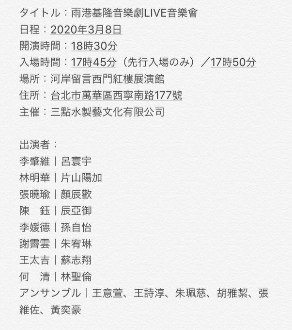 片山陽加@haachandayoo -- 3月8日音楽劇「雨港基隆」のLIVEが決定しました♡台北市内でやるんだけど是非とも旅行がてら観に来て下さい♡3aquaarts.kktix.cc/events/rainypo… pic.twitter.com/gXKJXd2dVA