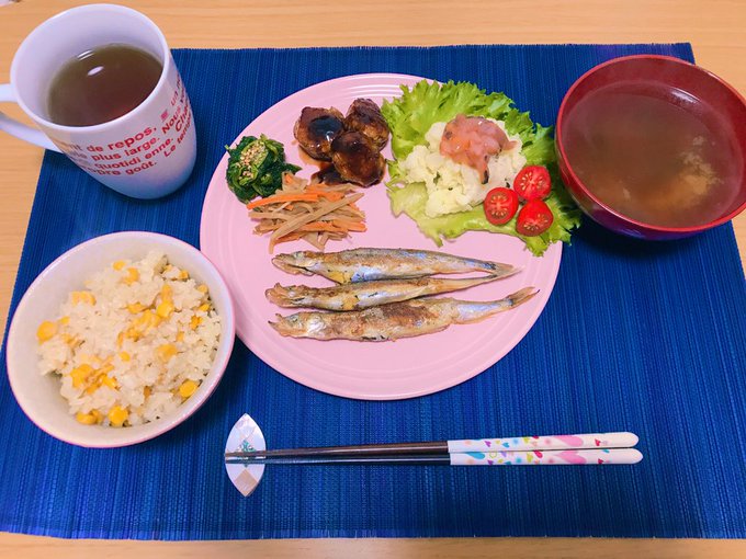 片山陽加@haachandayoo -- 料理苦手女子のごはん記録今日は和食。お皿がピンクはどーなの?と思いながら茶色にならないように彩に気をつけてみました!!コーンごはんは好きだから得意なの🌽 pic.twitter.com/iJKCrg1XdF