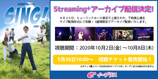 片山陽加@haachandayoo -- singのアーカイブ配信チケットが明日から発売開始されます!!!是非チェックしてね〜!!eplus.jp/sf/detail/3321… twitter.com/kbs_project/st… K.B.S.Project 【速報!】超青春合唱コメディ『SING!』-2020-Streaming+にて、アーカイブ配信決定!●期間:2020年10月2日(金)~10月8日(木)●受付開始:9月30日(水)~感動の舞台を是非ご覧ください!sing-stage.site#超SING2020 #streaming pic.twitter.com/qTTquWtKHg