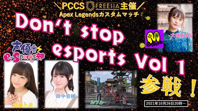 犬塚あさな@daisuki_wan -- よろしくお願いします🤲🥺🥺おさくと先生と出るよん♪ twitter.com/esports_land/s… esportsland/いーらじ PCCS Freesia主催ApexLegendsカスタムマッチを10月26日(火)20時から開催‼今回は声優e-sports部 様@seiyu_esports舞夢プロ e-sports部 様@maimu_esportsの2チームとアリーナマッチを実施致します!第2部として21時頃視聴者参加型カスタムマッチも開催決定!(リプに続きます) pic.twitter.com/Msdb45g4Xt