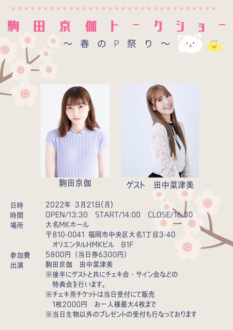 田中菜津美@mikanchiyan723 -- 3月21日福岡でぴーちゃんのイベントに呼んでもらいました💗もうチケット購入できるのでお時間合う方は是非会いに来てください🌸❣️やっとみんなに会える場所できた🥲🥲 twitter.com/komada_pychan_… 駒田京伽 3/21(月)福岡にてトークイベントを開催することになりました🐤初の福岡イベント🐤ゲストに田中菜津美先輩が来て下さいます🙇♀️🍊チケットの先行発売は2/27(日)10:00 〜 3/6(日)23:59販売開始され次第下記URLからご購入できます🐤eplus.jp/hirokakomada/ pic.twitter.com/TIVdByjN96