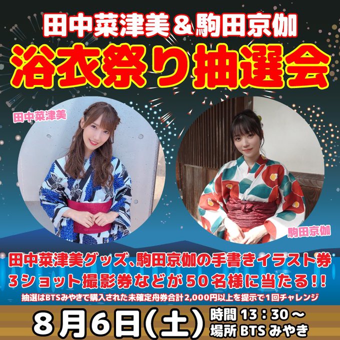 田中菜津美@mikanchiyan723 -- 8/6お待ちしてます❣️ボートしたり、夏らしいことして盛り上がりましょう🫶🏻✨浴衣姿の写真撮れる時間もあります‼︎ twitter.com/boatpiermiyaki… 【BTSみやき公式】管理人🚤(ボートレースチケットショップ) 8.6(土)13:30〜🎆浴衣祭り抽選会開催🎇詳しくは画像にてご確認下さい!抽選会終了後、YouTube公開収録(スイカ割🍉)も行います。浴衣姿の2人に、右ぃ〜!あ、いきすぎ!って声をかけて一緒に盛り上げましょう🤟お時間に余裕がある方は是非ご参加下さい🫡 pic.twitter.com/9ch3z6Nr26