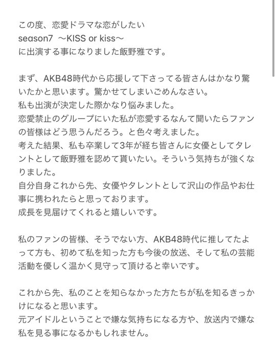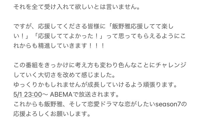 田北香世子@kayoyon213 -- 見るよーん🥰 twitter.com/miyabi_ichigo1… 飯野 雅 この度、恋愛ドラマな恋がしたいの新シーズンに出演する事になりました💋ABEMA 5/1 23:00start最新情報はドラ恋公式Instagramで随時発表されていきます!今の気持ちを書きました一読頂けると嬉しいですもし、嫌な気持ちになってしまった方がいたらごめんなさい。でも頑張らせてください。 pic.twitter.com/fZtXYjIJ5a 飯野 雅@miyabi_ichigo15 -- @kayoyon213 ありがとう😭