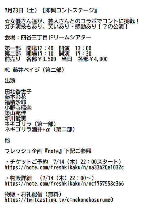 田北香世子@kayoyon213 -- 23日土曜日『即興コントステージ』出演させていただきます!👏久しぶりの出演!ドキドキワクワク!楽しみですねー😆是非遊びにきてください❣️この後22時からチケット、物販販売開始です!🎟 twitter.com/fleshkikaku/st… フレキカ 『即興コントステージ』7/23,8/14,他 7月23日(土)『即興コントステージ』🆕MC藤井ペイジ(2部)出演🆕田北香世子🆕藤本彩花🆕福積沙耶🆕小野寺瑠奈🆕築山苑佳🆕新川愛実🆕ネギゴリラ(1部)🆕ネギゴリラ酒井+α(2部)他ご予約(7/14 22時~note.com/freshkikaku/n/…物販(7/14 22時~早期特典有note.com/freshkikaku/n/… pic.twitter.com/pqWN6mKkrD 田北香世子@kayoyon213 -- みんな会いに来てくれるー?🥺