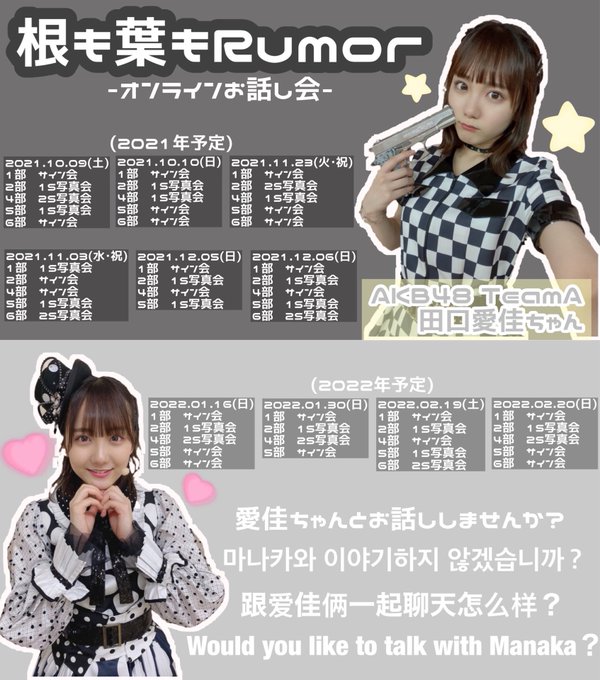 田口 愛佳@48manaka_16 -- 「根も葉もRumor」のオンラインお話し会が現在受付中です🤭🖤サインが人気らしいですが、私的には1Sが好きです!笑ぜひ待ってます🤞🏻akb48.chara-ani.com pic.twitter.com/Fso2Drw9kR