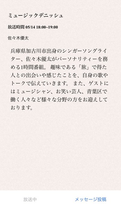 このあと18時からの佐々木優太さんミュージックデニッシュに出演させていただきました。