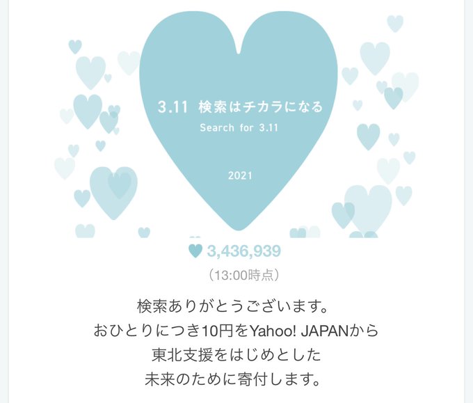 【3.11検索寄付】に参加しました。LINEで「3.11」と検索すると、LINE社からおひとりにつき10円を被災地支援や災害対策等のために寄付します。 lin.ee/jKBGzvb/suhz #311検索はチカラになる #東日本大震災から10年 #ヤフーLINE