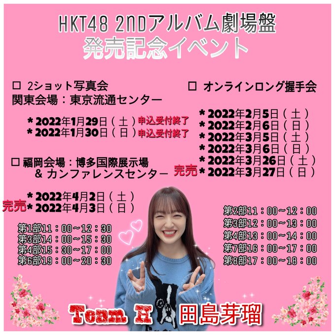 田島芽瑠@meru_chan_07 -- まだ応募可能な握手会や写メ会あります!最後に会いましょー♡entry.hkt48cd.shop/2ndalbum/?hktl… twitter.com/starcluster763… いひょじゅん🐰 <オンラインロング握手会>2月5日(土)-2部完。◎3,4,7,8部2月6日(日)-7,8部完。◎2,3,4部3月5日(土)-◎2,3,4,7,8部3月6日(日)-◎2,3,4,7,8部3月26日(土)-◎2,3,4,7,8部3月27日(日)-全部完売<2ショット写真会>4月2日(土)-6部完。◎1,3,4部4月3日(日)-全部完売◎応募可能#田島芽瑠#めるメール pic.twitter.com/OSwF3o2KXe