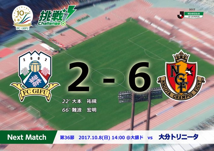 2017明治安田生命J2リーグ第35節vs名古屋グランパス戦は、2-6で敗れました。ご声援ありがとうございました。 #fcgifu #FC岐阜 #DAZN pic.twitter.com/dnt9xYKkDr