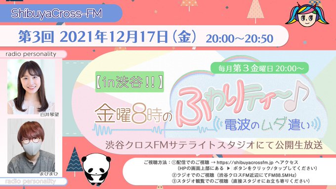 Shirai Kotono@shir0chaan -- 12月の #ふわムダ は17日です👧🏻スタジオでお待ちしています〜!19日のイベントのチケットも発売中なので、ぜひ遊びに来てね🎅🏻↓t.livepocket.jp/e/suvze twitter.com/scfm_fuwamuda/… 【in渋谷‼️】金曜8時のふわりティ〜🎶 〜電波のムダ遣い〜【公式】 【in渋谷‼︎】金曜8時のふわりティ〜♪〜電波のムダ遣い〜次回12月17日(金)20:00〜渋谷クロスFMサテライトスタジオにて公開生放送‼️MC: 白井琴望、まひまひ放送は①webサイトshibuyacrossfm.jp②渋谷界隈にてFM88.5MHz③スタジオ観覧にてお楽しみください🥳#ふわムダ pic.twitter.com/CED09HaLRY