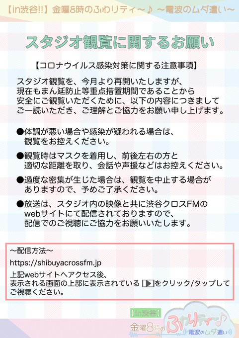 白井琴望@shir0chaan -- よろしくお願いします😊 twitter.com/scfm_fuwamuda/… 【in渋谷‼️】金曜8時のふわりティ〜🎶 〜電波のムダ遣い〜【公式】 お知らせ📣【in渋谷!!】金曜8時のふわりティ〜♪〜電波のムダ遣い〜ふわムダの観覧を次回放送より再開いたします。再開にあたり、観覧をご希望される方におきましては、添付画像の内容をご確認の上、スタジオへお越しいただけたらと思います。何卒ご理解のほどよろしくお願い申し上げます🙇♀️ pic.twitter.com/i1xrP1VjDZ