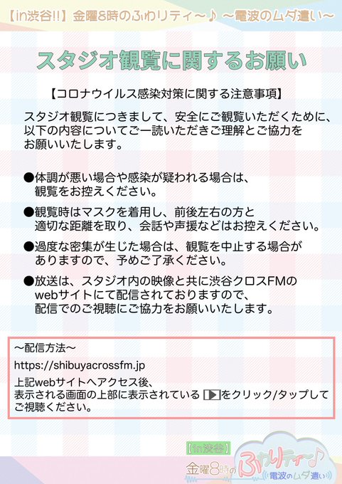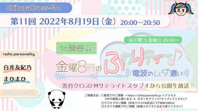 白井琴望@shir0chaan -- 来週の #ふわムダ はゆっちがMCを務めてくれます!みなさん監視お願いします🙇🏻 twitter.com/scfm_fuwamuda/… 【in渋谷‼️】金曜8時のふわりティ〜🎶 〜電波のムダ遣い〜【公式】 【in渋谷‼︎】金曜8時のふわりティ〜♪〜電波のムダ遣い〜次回8月19日(金)20:00〜渋谷クロスFMサテライトスタジオから公開生放送MC: 白井友紀乃、まひまひ※白井琴望はお休みとなります配信でのご視聴はこちらshibuyacrossfm.jp#ふわムダ pic.twitter.com/eWvYgCK1h3