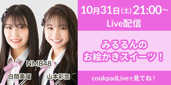 白間 美瑠@shiromiru36 -- お楽しみにっっ❤️ twitter.com/cookpadtv_live… cookpadLive 【ニュース】10/31(土)21時~人気アイドルNMB48白間美瑠さんの配信が決定✨ 今回のゲストは山本彩加さんに決定🍰しかもみるるんプロデュースの絶品スイーツも配信中に販売するよ💕こうご期待😊cookpadLiveをDL➔cookpad.tv/episodes/12646 #cookpadLive pic.twitter.com/mNvcNDvEpl