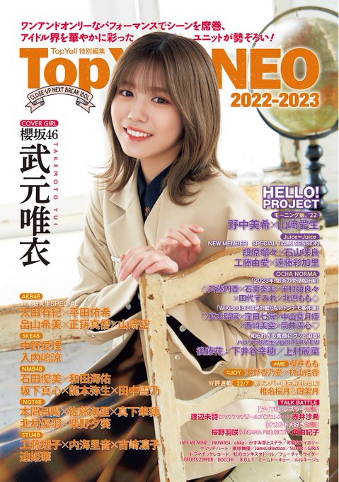 真下華穂(ましもかほ)@k_a_h_o_chan -- 来週発売のTopYellNEO2022~2023 さんに掲載させていただきます!🙇🏻♀️シングル関係で取材していただくの初めてだったので嬉しかった〜〜🥹ぜひ!#NGT48 twitter.com/topyell/status… TopYellNEO 来週12月28日発売の『TopYellNEO2022~2023』の表紙巻頭には #櫻坂46 の #武元唯衣 さんが登場❗️ 今秋開催された全国アリーナツアー、そしてツアーファイナルの東京ドーム公演のエピソードや卒業した初代キャプテン・菅井友香への感謝の気持ち、地元滋賀への溢れる愛などたっぷりと伺いました🌸 pic.twitter.com/WaYs8SlOEZ