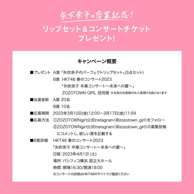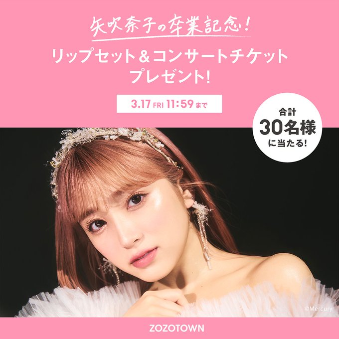 矢吹奈子@nako_yabuki_75 -- 明日までです!!😳✨まだご応募されてない方は是非!✨ twitter.com/zozojp/status/… ZOZOTOWN \明日3/17㈮11:59まで!/HKT48 #矢吹奈子(@nako_yabuki_75)卒業記念!リップセット&コンサートチケットプレゼントキャンペーンがいよいよ明日終了!お見逃しなく💄🌸応募はInstagramから☛@zozotown_girl#プレキャン #卒業リップ #卒業コンサート #卒業 pic.twitter.com/QchjSEzDnK
