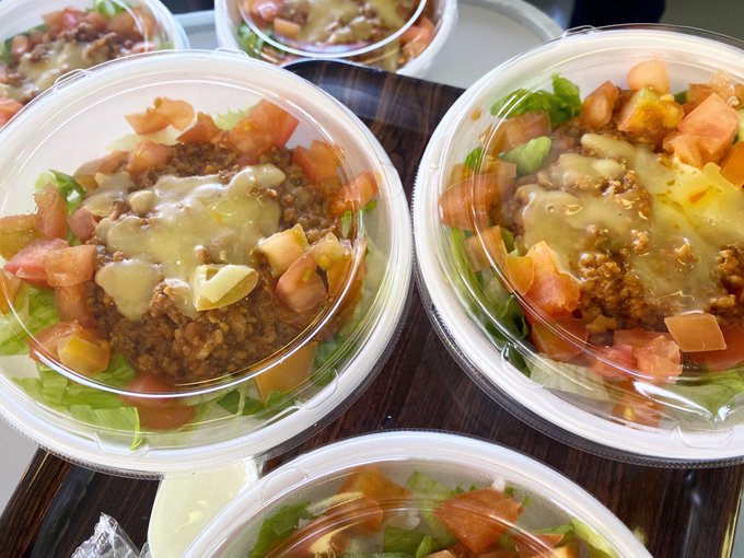港のカフェのタコライスをみんなで食べてます