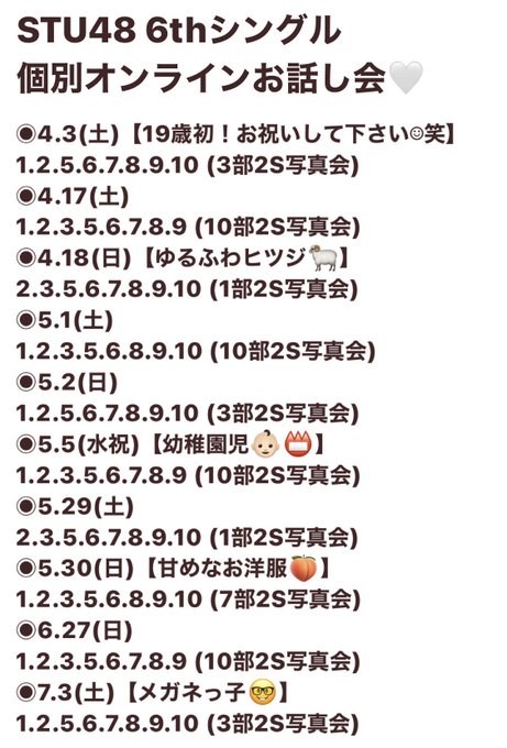 石田千穂@_ishida_chiho -- 6thシングルお話し会お待ちしてます☺︎stu48.chara-ani.com pic.twitter.com/TWimHC5IlK 石田千穂@_ishida_chiho -- 話せるのもめっちゃ楽しみなんじゃけど、オンラインお話し会予約してくださった方から抽選で、直接会って話せるのもとても楽しみ☺️!今日の13時までが第一次受付です〜お忘れなきよう、、!