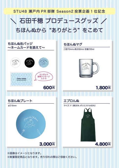 石田千穂@_ishida_chiho -- 明日、STU48祭in幕張メッセ瀬戸内PR部隊 投票1位を記念したグッズが販売されます!数量限定なので是非ゲットしてね pic.twitter.com/gmrwVLNHMx 石田千穂@_ishida_chiho -- 缶バッチのネームカードはランダムで直筆メッセージが入ってます! pic.twitter.com/AZkMildgUM