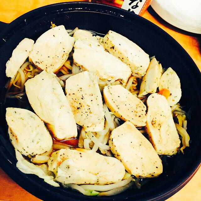 シリコンタジン鍋にもやしキャベツ人参ニラなど入れて、サラダチキンをのせます!あとは塩胡椒をしてチンするだけー( ´ ▽ ` )ノ楽チンかよ!