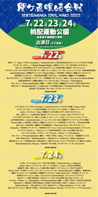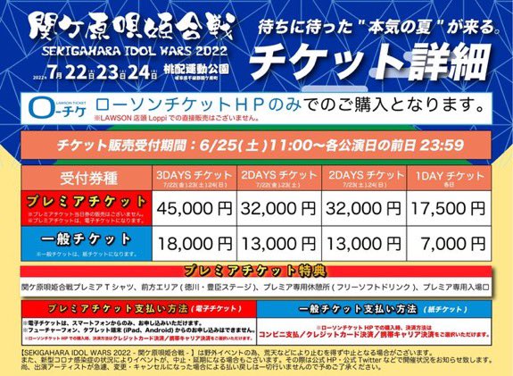 石田晴香@はるきゃん@can2525can -- #関ケ原唄姫合戦2022 SAISONは3days出演します!チケット販売開始しました✨熱中症対策を充分にして遊びに来て欲しいな🥰#セゾン twitter.com/saison_idol/st… SAISON 【3days参戦決定‼️】SEKIGAHARA IDOL WARS 2022 - 関ケ原唄姫合戦-▪️会場:桃配運動公園▪️7/22(金)開場9:30/開演11:00▪️7/23(土)開場8:30/開演9:30▪️7/24(日)開場8:30/開演9:30▪️チケット(25日 11:00~)プレミア/一般/当日(一般1Dayのみ)🎫 l-tike.com/idolwars#関ヶ原唄姫合戦 #本気の夏 pic.twitter.com/Smcp0DS8jF