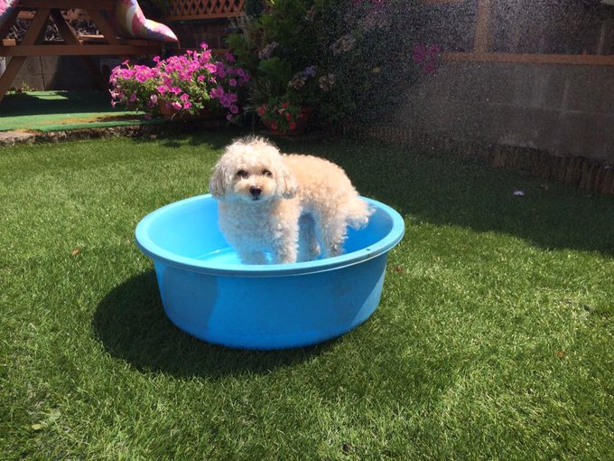 磯佳奈江@isokana89 -- おはようございます!愛犬プリンが暑すぎてプールに入ってる!って写真送られてきた☺️かわいすぎ今日も頑張れるな!( ˆOˆ ) pic.twitter.com/pSRbJHsIZa