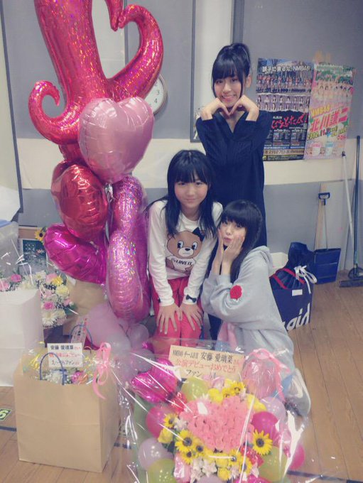 磯佳奈江@isokana89 -- 安藤えりなちゃん逆上がり公演初日!おめでとう!!早く一緒にステージ立ちたいな(^^)写真撮ってたらみおさんとここちゃん乱入😑💓 pic.twitter.com/HA5rVJM3iS